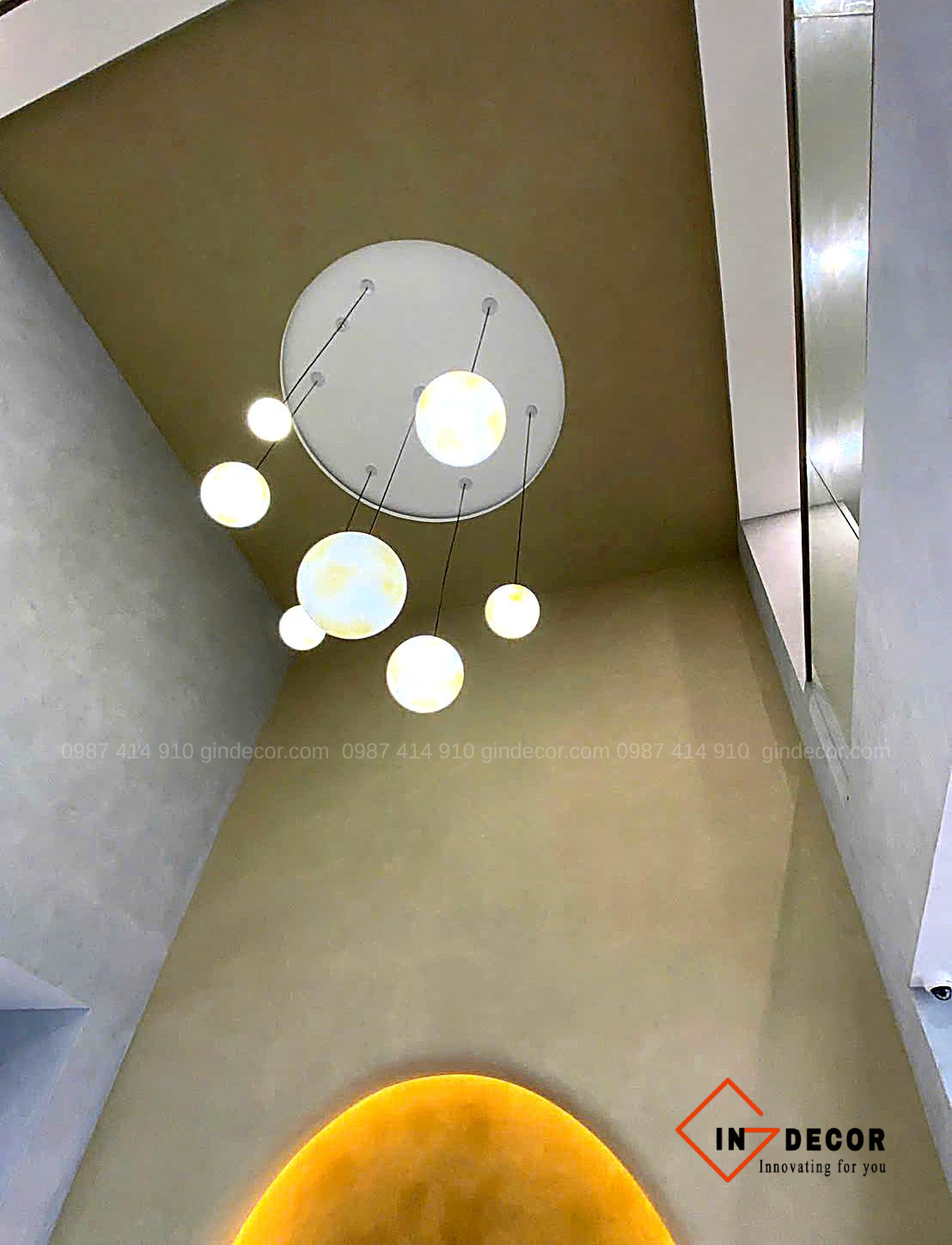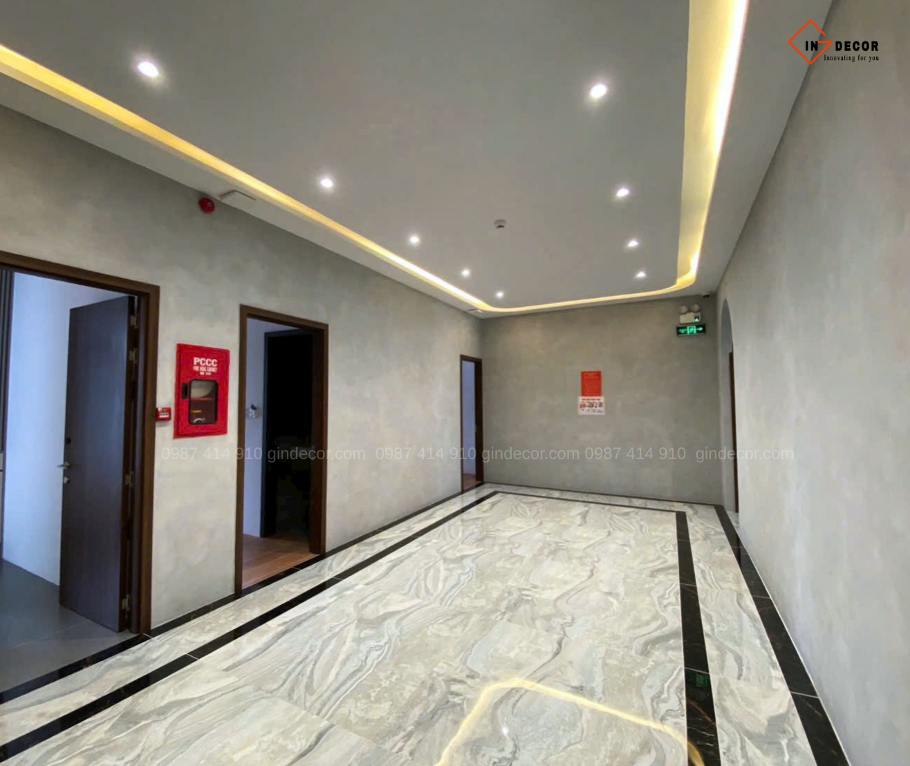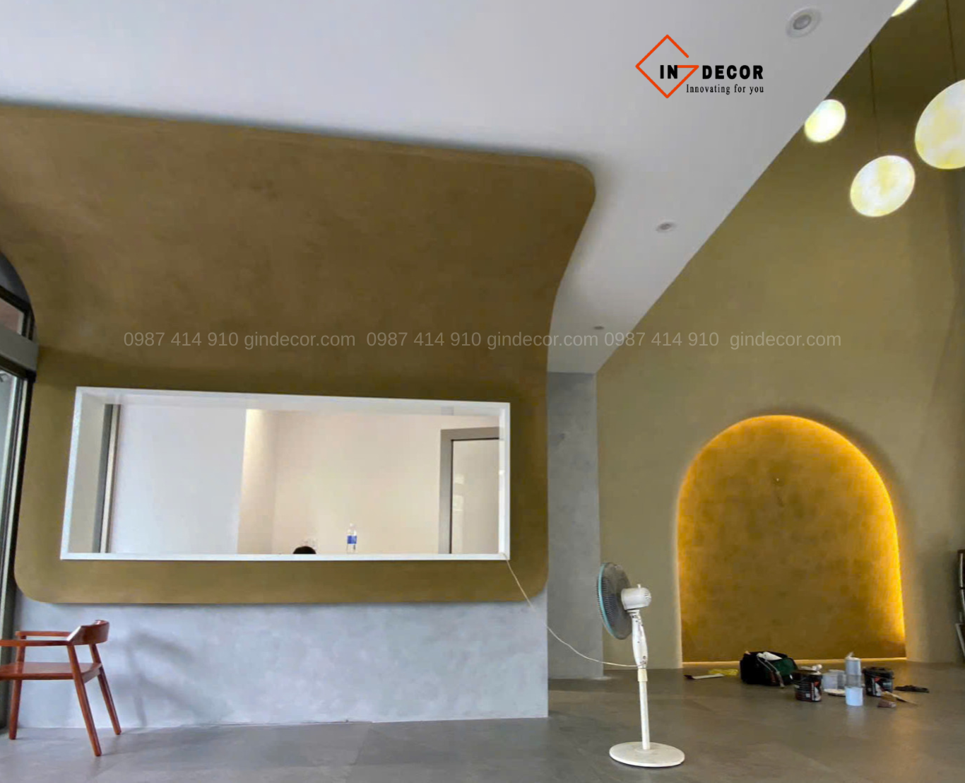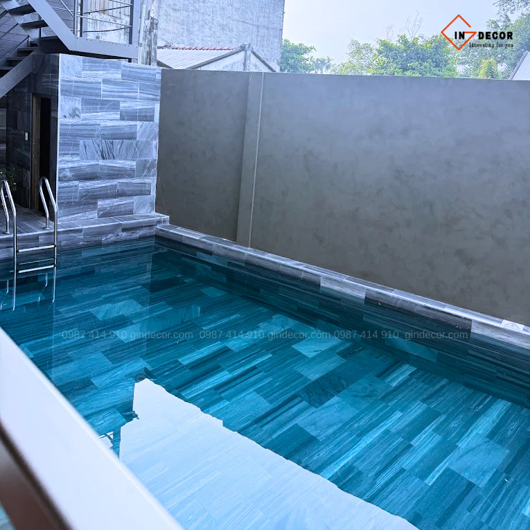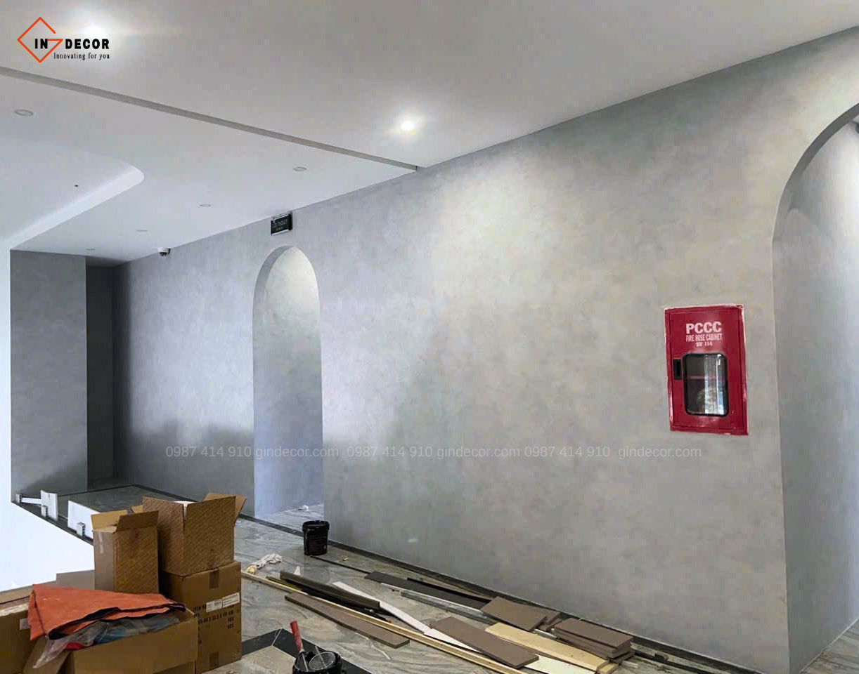 Sơn hiệu ứng bê tông được ứng dụng xuyên suốt từ khu vực sảnh, hành lang đến các không gian chức năng, tạo nên bề mặt có chiều sâu, hiệu ứng ánh sáng độc đáo và cảm giác chân thực như bê tông tự nhiên. Đội ngũ thi công của Gin Decor đã xử lý tỉ mỉ từng chi tiết, đảm bảo độ đồng đều, độ bền cao và tính thẩm mỹ lâu dài.