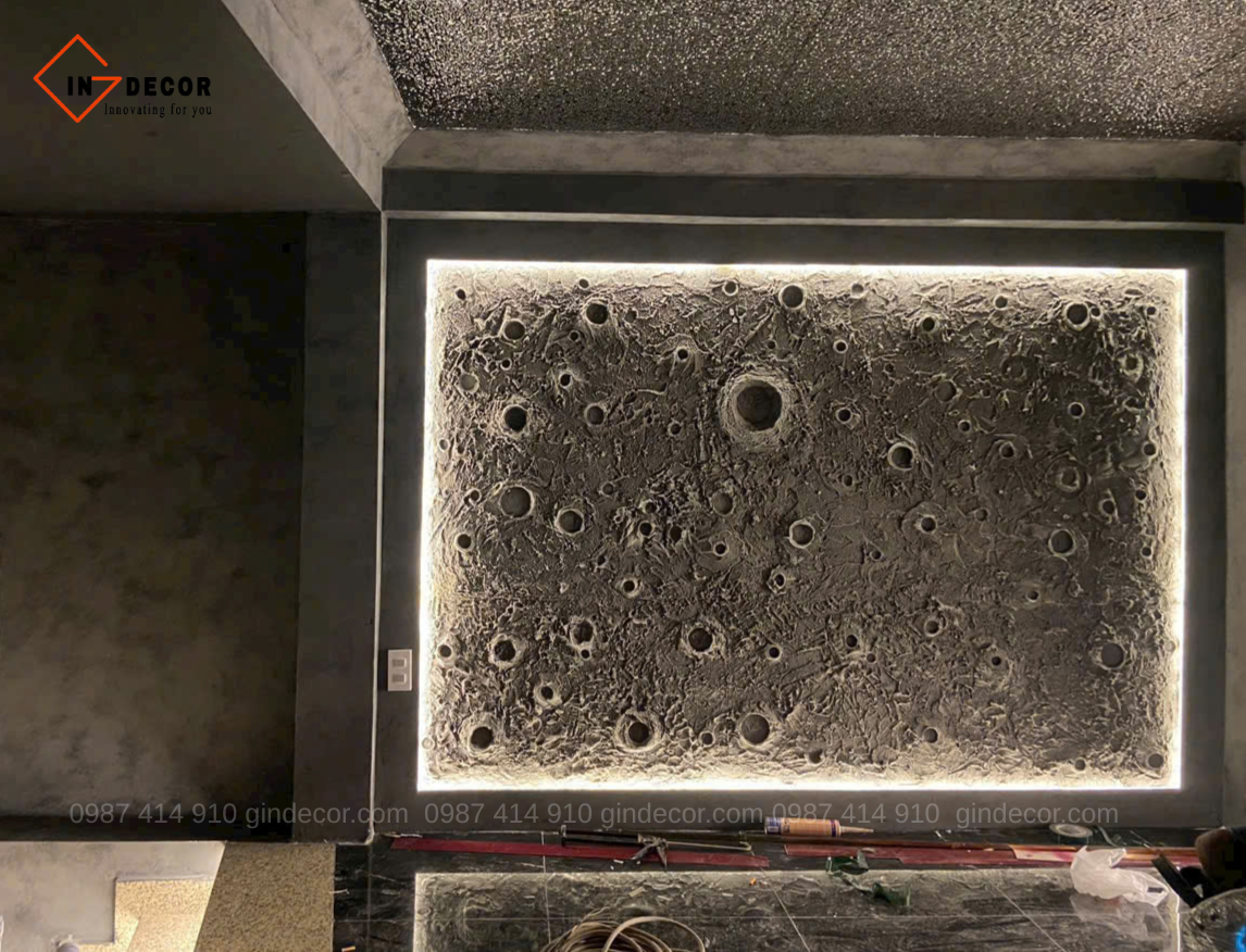 Đặc biệt, một số khu vực được thi công texture 3D với hiệu ứng giống bề mặt tự nhiên, tạo chiều sâu thị giác ấn tượng. Khi kết hợp cùng ánh sáng hắt, từng đường vân và chi tiết của sơn hiệu ứng bê tông được làm nổi bật, giúp không gian trở nên sống động và cuốn hút hơn.