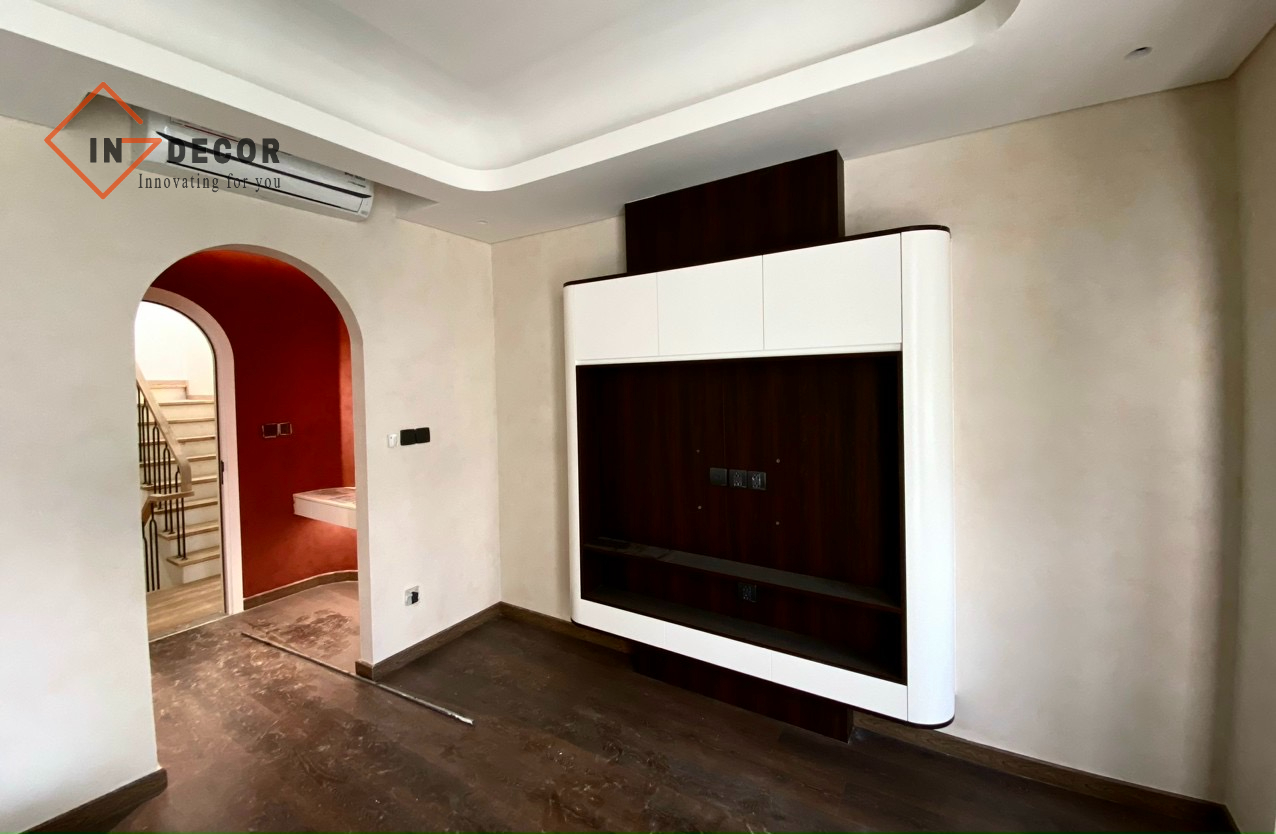 Phòng khách là không gian trung tâm của ngôi nhà. Một mảng tường sơn hiệu ứng bê tông Gindecor phía sau sofa hoặc kệ tivi có thể trở thành điểm nhấn ấn tượng. Kết hợp cùng đèn hắt sáng và nội thất đơn giản, không gian trở nên hiện đại và cá tính hơn.